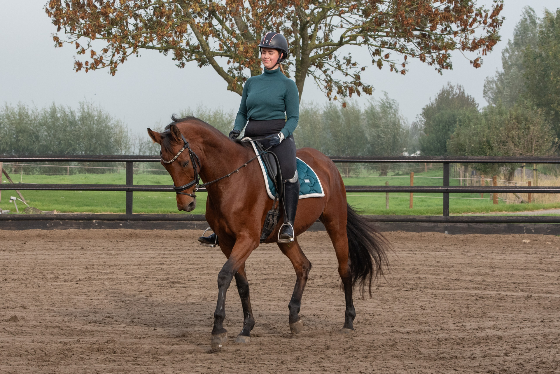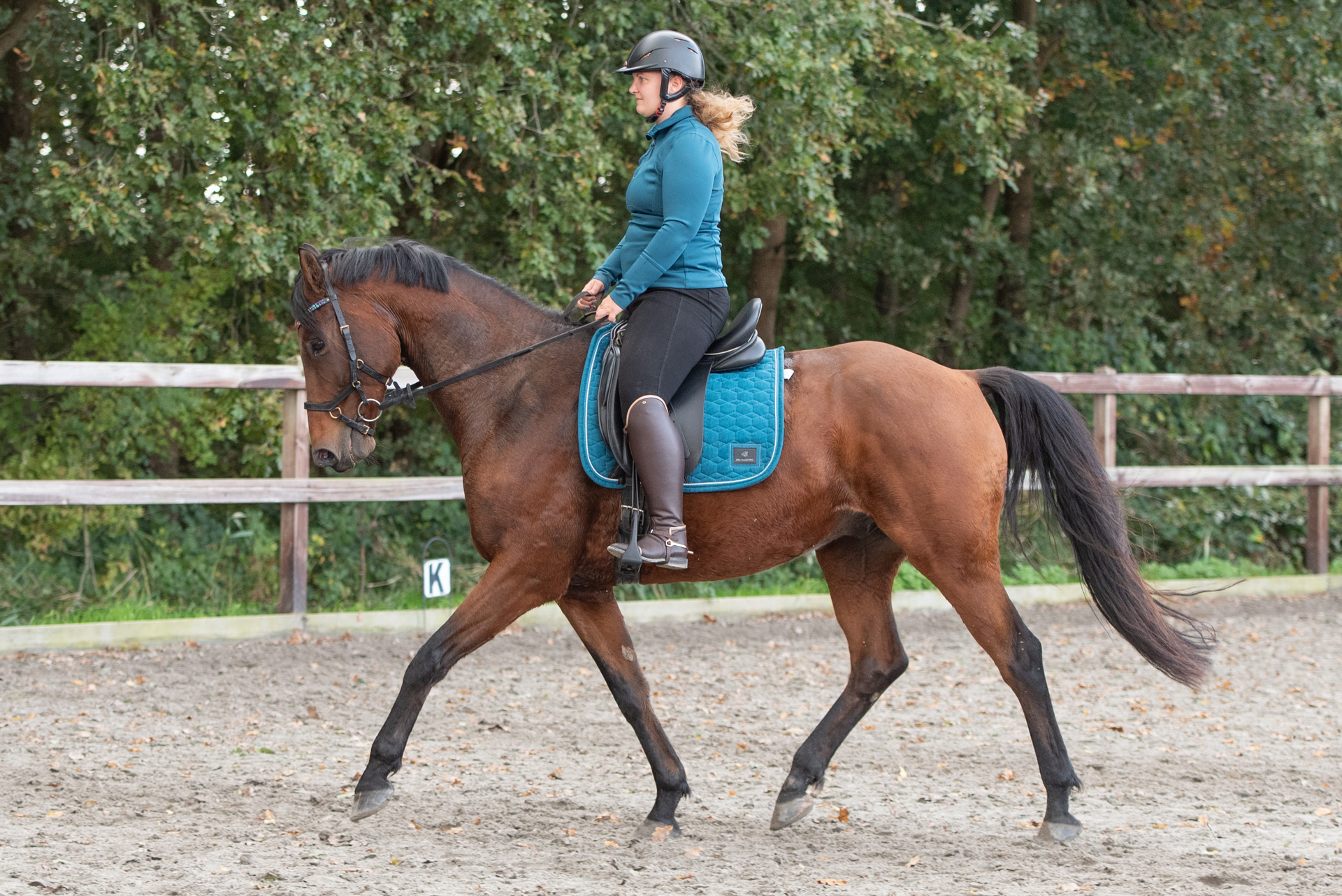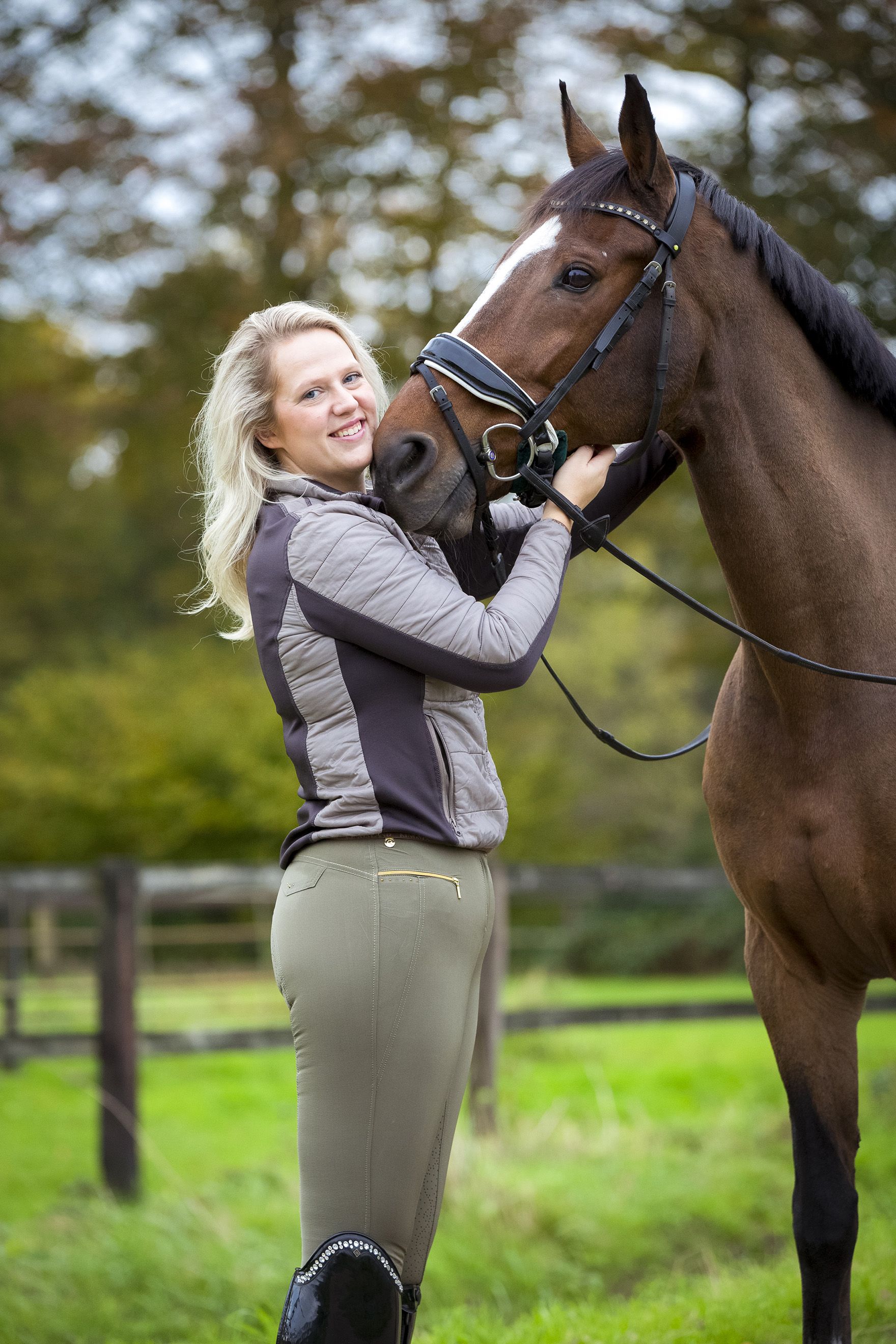 Nu ben ik daar veel bewuster van en houd ik er rekening mee tijdens het rijden. Ik zit veel rustiger in het zadel en blijf beter in balans. Met als gevolg dat mijn paard ook constanter loopt en minder gewicht hoeft op te vangen. Mijn belangrijkste motivatie om aan dit traject mee te doen was mijn jonge paard die dit jaar zadelmak werd gemaakt. Ik wilde haar tijdens het inrijden niet in de weg zitten en ik kan zeggen dat het is gelukt. Deze zomer zat ik er voor het eerst op en binnen een paar weken konden we al stappen, draven en galopperen. Ze staat nu in training om verder doorgereden te worden. Ook ga ik het paard van mijn moeder binnenkort uitbrengen in de L1 dressuur. Ik ben blij dat ik dit jaar deze kans kreeg om deel te nemen aan dit traject en ben zeer tevreden over de resultaten. Natuurlijk was het heus niet altijd makkelijk. Ik moest soms echt de motivatie vinden om te sporten. Zeker als je eigenlijk gewoon lekker op de bank wilt ploffen. Maar juist op die momenten is de voldoening nog groter als je doorzet en een training afmaakt. Ik ben nu niet alleen fitter, maar heb ook veel meer kennis als ruiter. Ik heb meer zelfvertrouwen tijdens het rijden en kan niet wachten om de training van mijn jonge paard volgend jaar verder op te pakken.” <